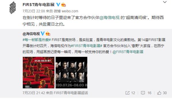 7月23日,海信电视官方微博发布FIRST青年电影展联合海报,官宣了海信作为影展官方合作伙伴的新身份。