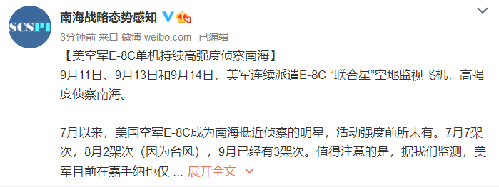 【环球网综合报道】据“南海战略态势感知”计划平台14日发布的消息,9月11日、9月13日和9月14日,美军连续派遣E-8C “联合星”空地监视飞机,高强度侦察南海。消息称,自7月以来,美国空军E-8C成为南海抵近侦察的“明星”,活动强度前所未有:7月7架次,8月2架次(因为台风),9月已经有3架次。