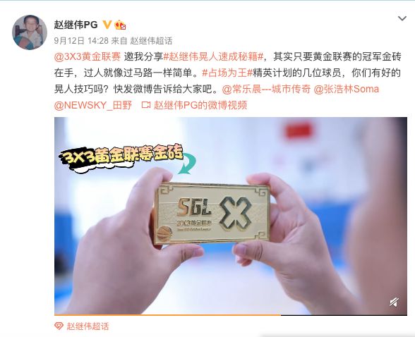 3X3黄金联赛为球员们打造的#占场为王#话题为例,自上线以来,累计已获得超过2亿的阅读量和28.8万的话题讨论量;3X3黄金联赛给予球员的不仅是资源上的支持,作为3X3黄金联赛的“黄金导师”,赵继伟在微博分享了趣味过人“秘籍”,同时他通过线上互动的方式点名张浩林、田野、常乐晨等三位“占场精英计划”球员参与,对于众多草根球手来说,他们也许从不曾想过,有一天,以赵继伟为代表的职业球员会通过微博和他们隔空喊话,鼓励他们挑战自我,而得益于新浪体育的助推计划,这种不可能,已成为可能。