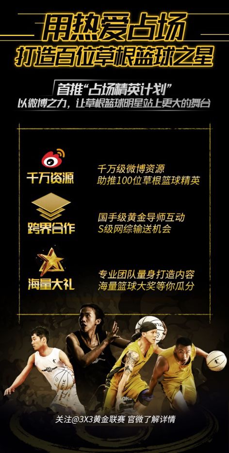 2020赛季,随着新浪体育重磅推出3X3黄金联赛“占场精英计划”,通过这一群众性体育赛事IP吸引了诸多优秀球手签约。参加3X3黄金联赛的球手,不仅可以提升球技和增长人气,于赛场以外也将获得更多机会。同时,新浪体育拿出千万级别的微博资源,为赛事优秀选手进行线上助推。