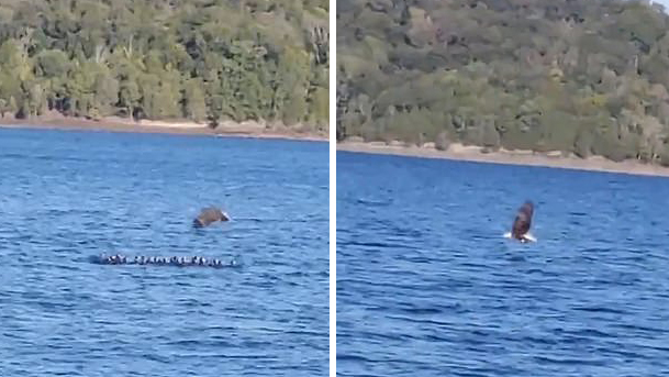 当时这只老鹰徘徊在水面上约10米处,鸭子们聚集在一起躲避攻击,大约1小时左右,一只鸭子脱离群体,秃鹰俯冲下来将它抓走。