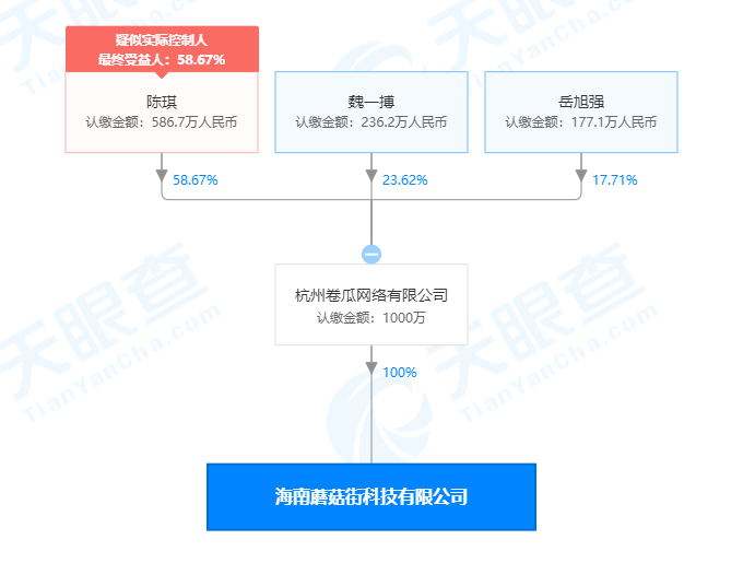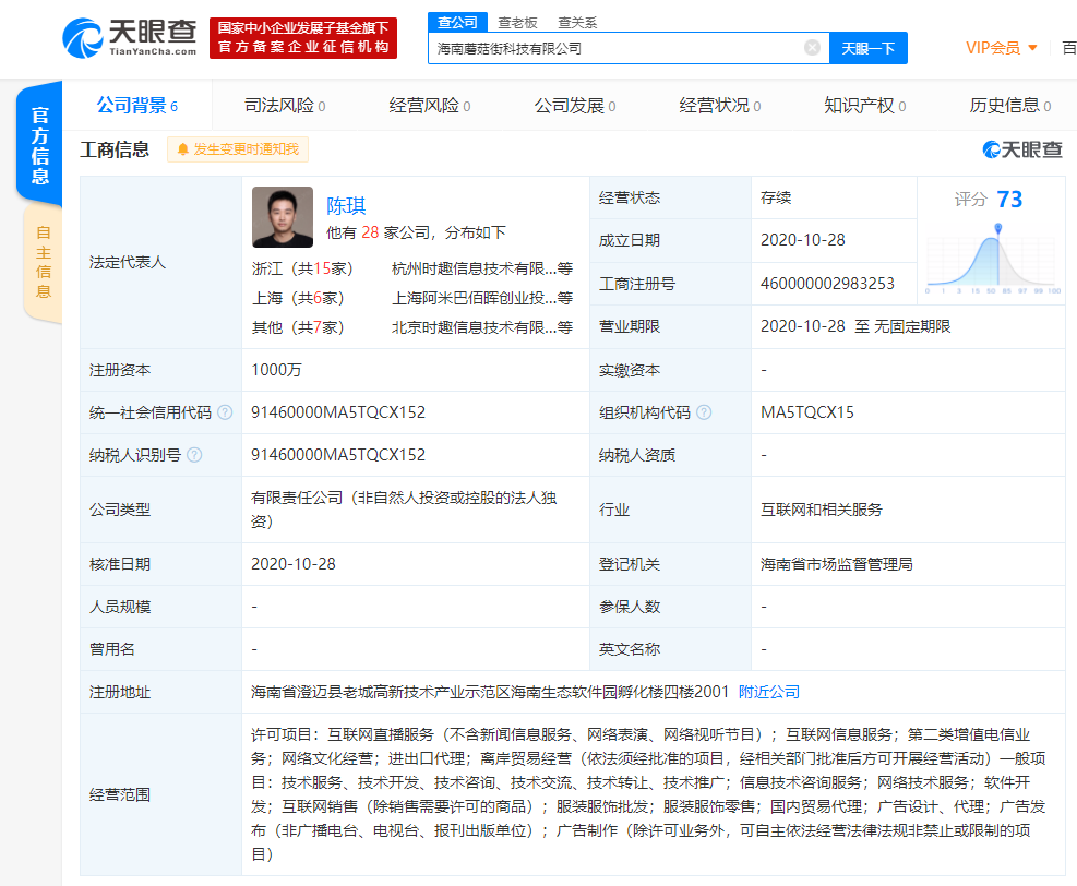 【环球网综合报道】天眼查App显示,近日,海南蘑菇街科技有限公司成立,注册资本1000万,法定代表人为蘑菇街创始人&CEO陈琪,经营范围含互联网直播服务(不含新闻信息服务、网络表演、网络视听节目),网络文化经营,进出口代理,离岸贸易经营,互联网销售;服装服饰批发;服装服饰零售等,该公司由蘑菇街的关联企业杭州卷瓜网络有限公司全资持股,后者的最大股东为陈琪。
