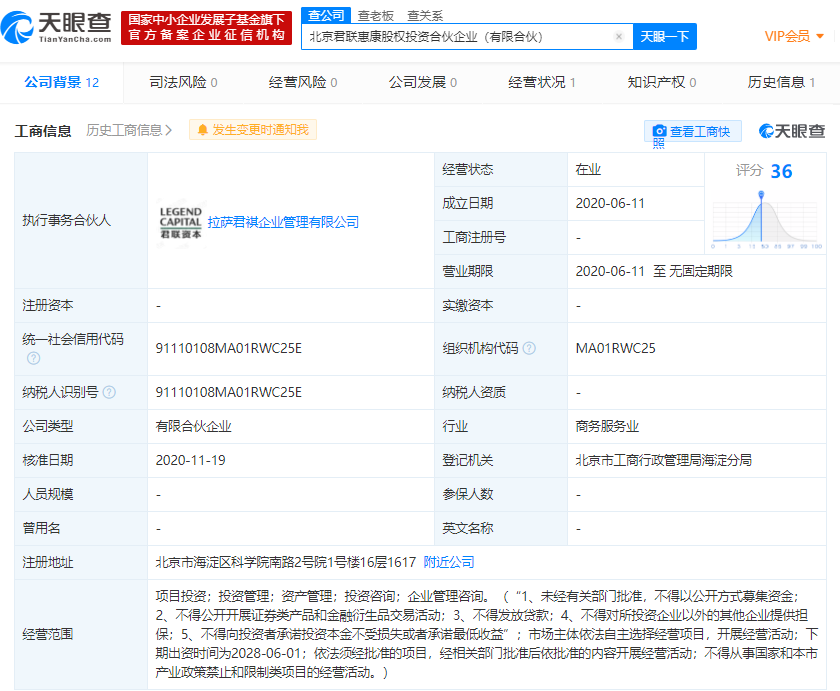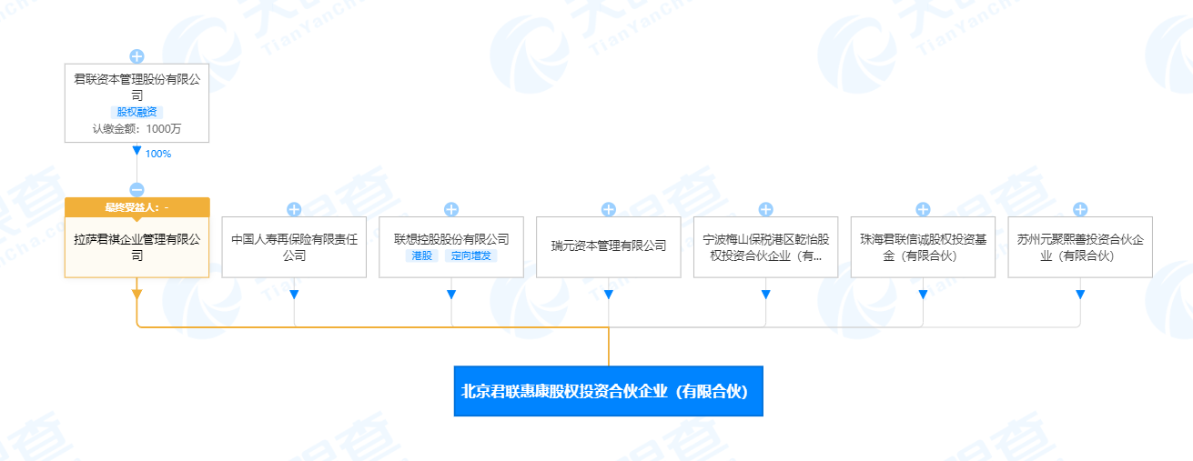 天眼查App显示,北京君联惠康股权投资合伙企业(有限合伙)成立于2020年6月,执行事务合伙人为拉萨君祺企业管理有限公司,后者由君联资本管理股份有限公司全资控股。