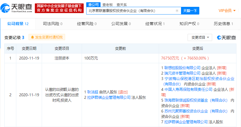 【环球网综合报道】11月19日,北京君联惠康股权投资合伙企业(有限合伙)发生工商变更,原自然人股东耿洁超退出,新增联想控股股份有限公司、瑞元资本管理有限公司、中国人寿再保险有限责任公司等6位投资人。此外,该公司注册资本由100万元增加至约7.7亿元,增幅为76650%。