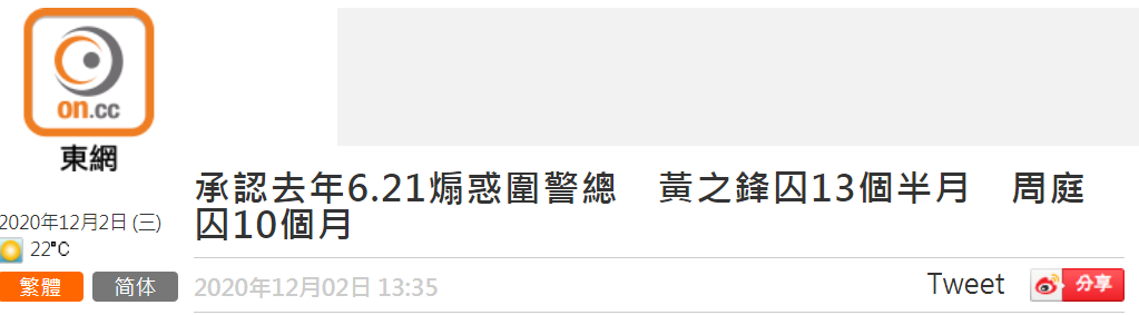 香港“东网”报道,其中承认煽惑及组织未经批准集结两罪的黄之锋,被判监禁13个半月。而承认煽惑罪的林朗彦则被判监7个月;承认煽惑及参与未经批准集结两罪的周庭,则被判监10个月。周庭随即申请保释外出等候上诉,但遭法庭拒绝。