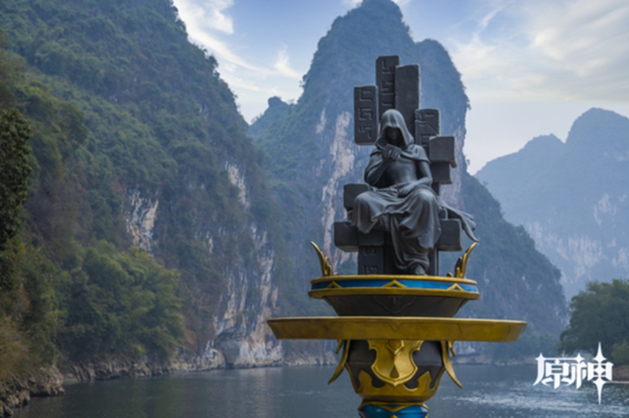岩神像和传送锚点作为游戏中的地标,能够帮助玩家在开放大世界中快速旅行。在桂林景区放置游戏中的标志性建筑,除了给景区带来二次元的活力,更希望它们也能成为大家在现实中的「传送点」,带动玩家走出家门,来到青山绿水之间,近距离感受祖国山河的瑰丽秀美。