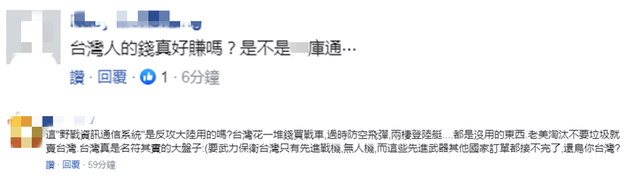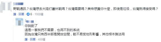 也有网友称,“野战通讯?台湾想去大陆打丛林战吗?台湾需要吗?美帝想卖你什么,即使是垃圾,台湾就得接受吗?”“您说对了,这是一套我们不需要,也用不到的系统,因为台湾只有西半部是开放空间,较不易受地形影响,其他根本无法用。”