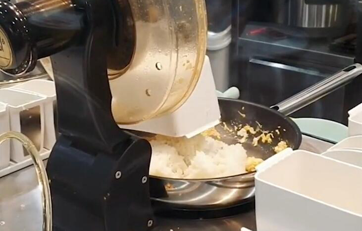 新加坡一家餐厅有五个做饭机器人,能在数十秒内炒各种饭。视频中的一个机器人先把三个鸡蛋炒熟,然后滑轨上的配料盒向锅里倒入米饭,机器人继续炒饭,直到完成。工作人员只需要将饭从机器人的锅里盛出来,端给顾客。有网友称这种做法省时省力,有人则认为这顿饭有点敷衍。