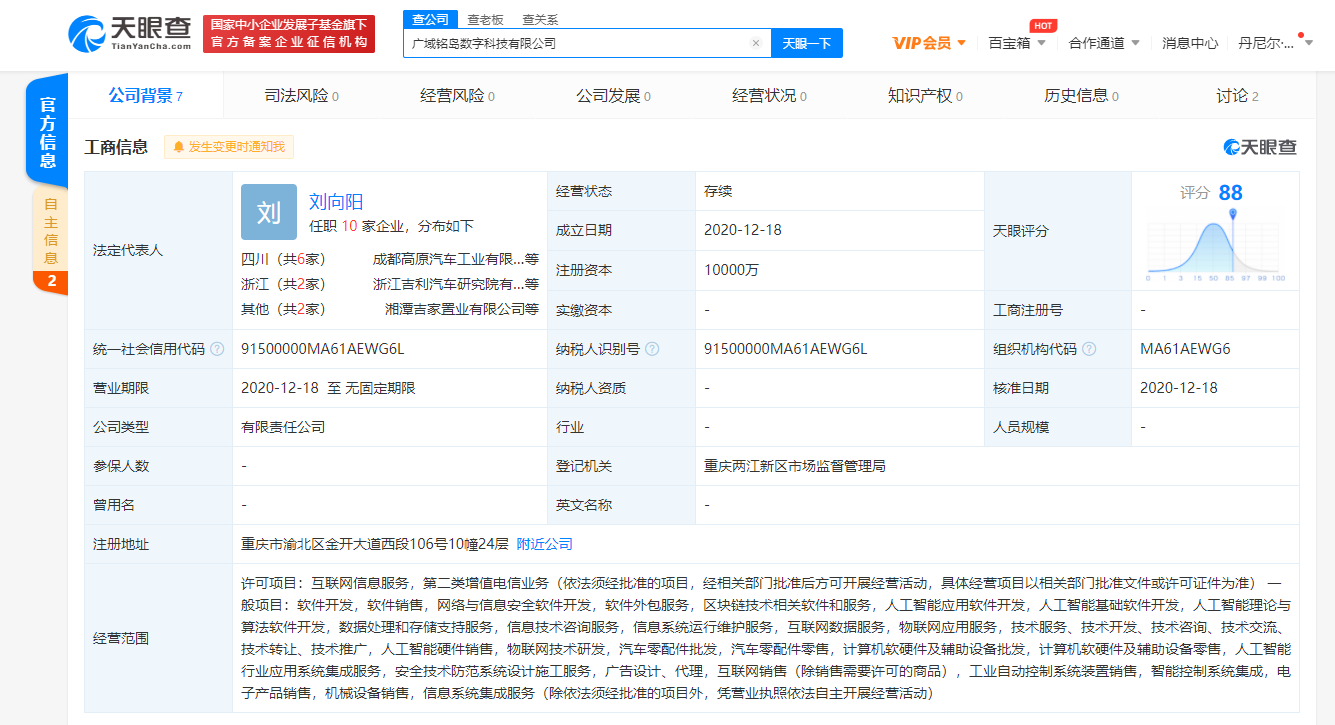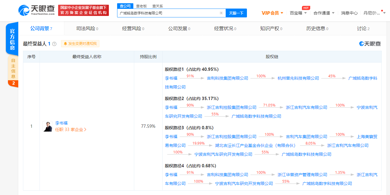 【环球网综合报道】天眼查App显示,近日,广域铭岛数字科技有限公司成立,由宁波吉利汽车研究开发有限公司和杭州普兆科技有限公司(由吉利科技集团有限公司100%持股)共同持股,经营范围含区块链技术相关软件和服务、人工智能应用软件开发、人工智能基础软件开发、人工智能理论与算法软件开发等,注册资本1亿,李书福为最终受益人和疑似实际控制人。