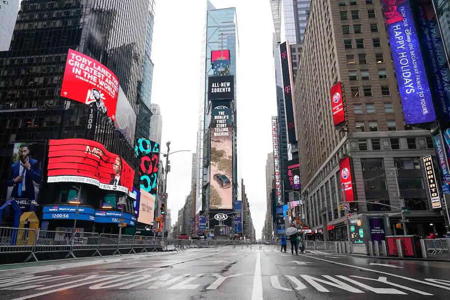 (2020年12月31日跨年庆祝活动前夕,时代广场附近的街道。)