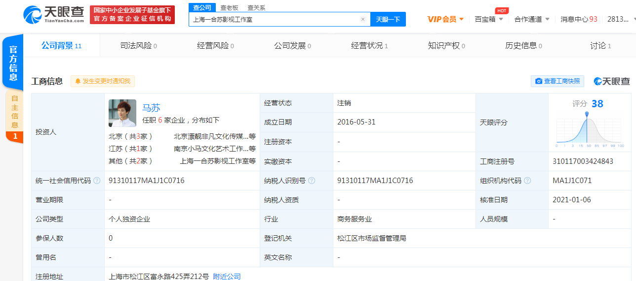 【环球网综合报道】天眼查App显示,近日,马苏全资控股的上海一合苏影视工作室发生工商变更,企业状态从存续变更为注销。