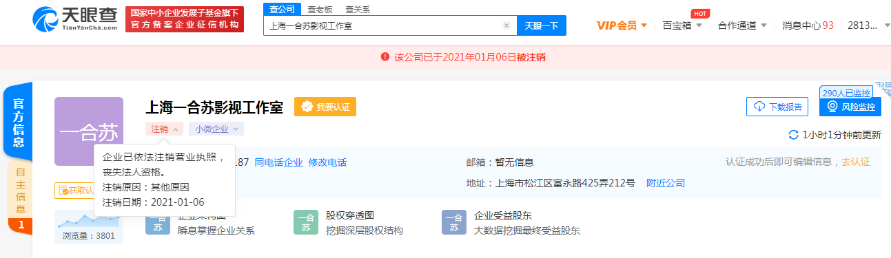 演员马苏名下影视作室于近日注销