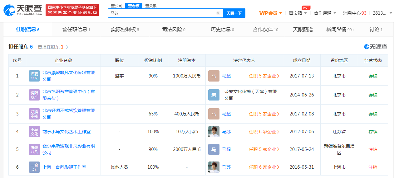 天眼查App显示,马苏担任股东,依然存续的公司共有4家,分别为北京漂靓非凡文化传媒有限公司、北京锦阳资产管理中心(有限合伙)、北京好酒不戒餐饮管理有限公司、南京小马文化艺术工作室。