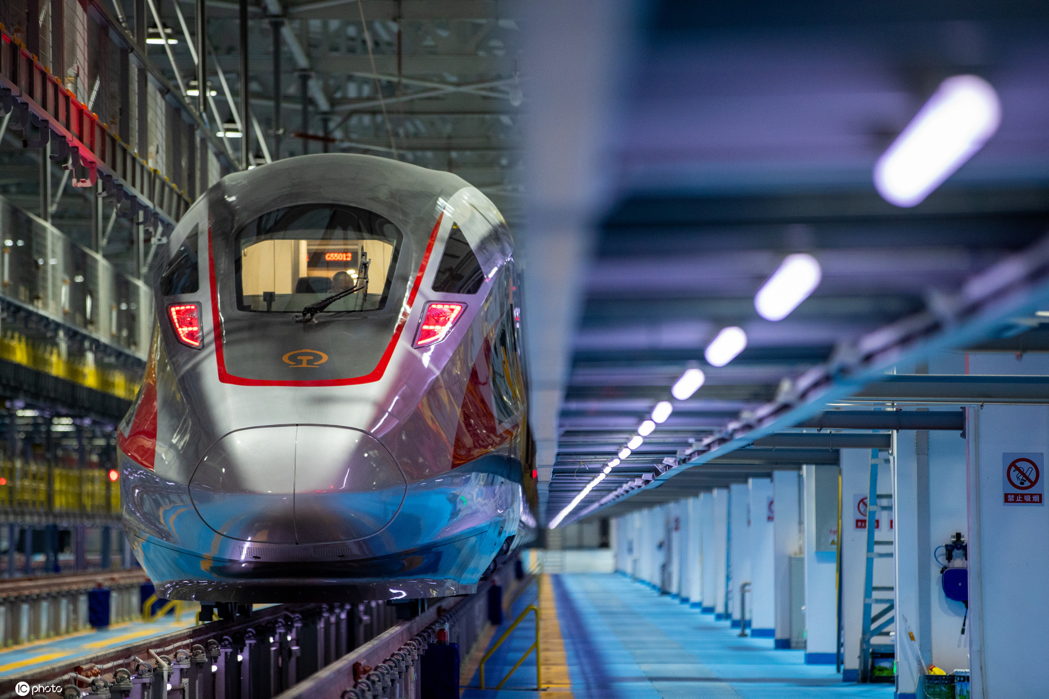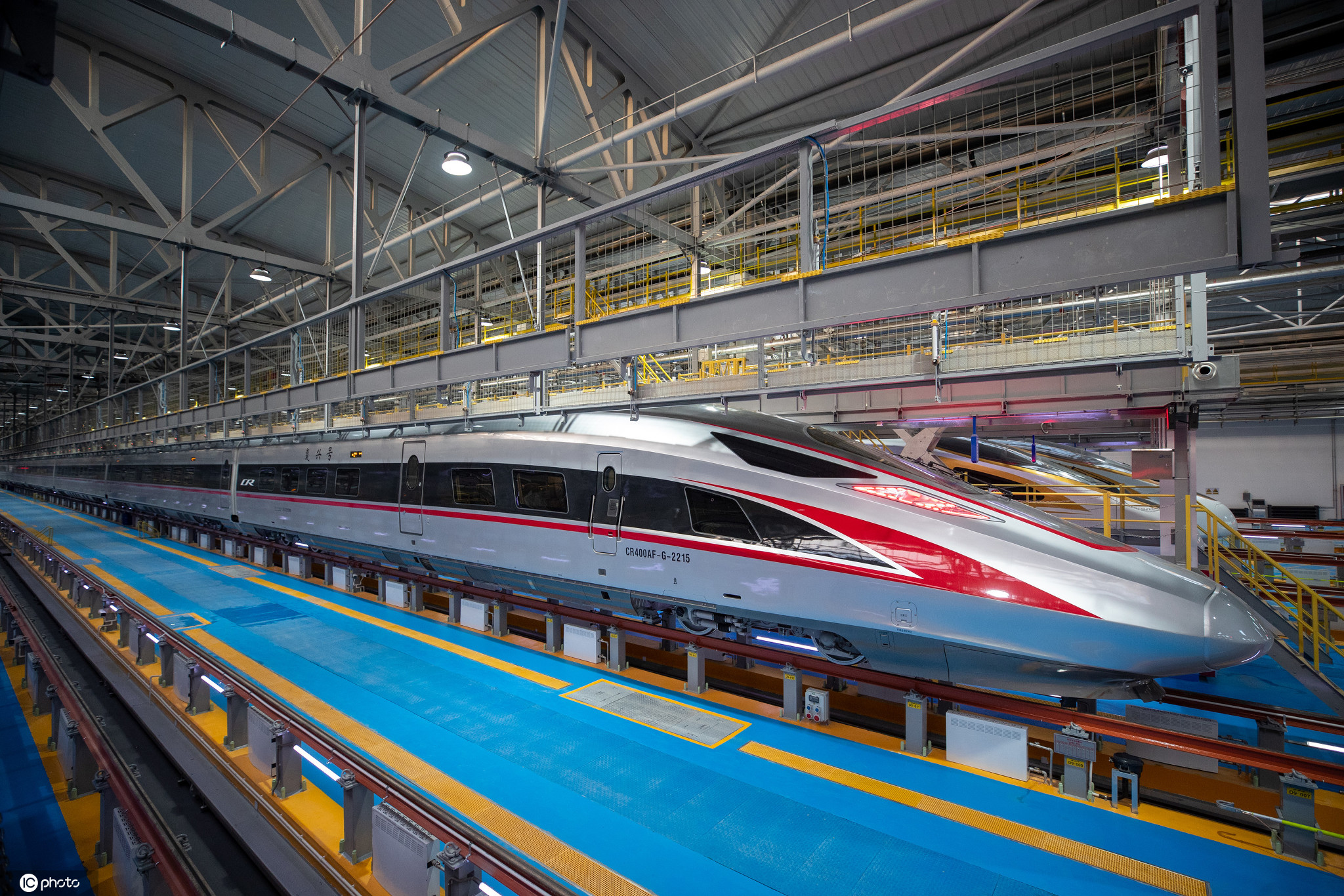 由中车四方股份公司研制的我国新型时速350公里CR400AF-G复兴号高寒动车组首次在中国铁路北京局集团有限公司北京动车段朝阳动车所亮相。