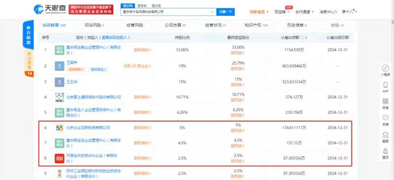 58关联公司投资重庆啄木鸟网络科技有限公司,后者股东含小米关联公司
