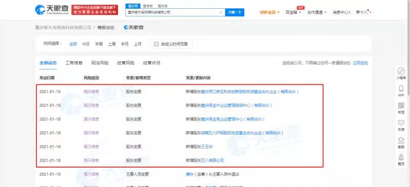 【环球网综合报道】天眼查App显示,1月18日,重庆啄木鸟网络科技有限公司发生工商变更,新增股东五八有限公司,湖南五八阡陌股权投资基金合伙企业(有限合伙),重庆啄金兔企业管理中心(有限合伙),重庆啄金牛企业管理咨询中心(有限合伙),重庆两江新区科技创新股权投资基金合伙企业(有限合伙),王玉华。
