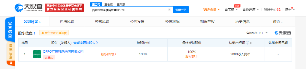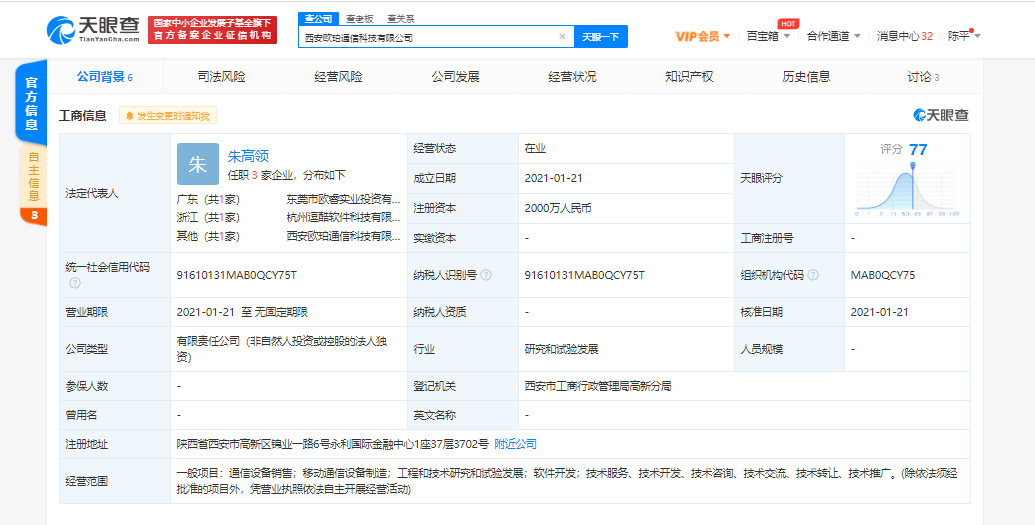 【环球网综合报道】天眼查App显示,西安欧珀通信科技有限公司于1月21日成立,注册资本2000万元,法定代表人为朱高领,公司经营范围包括通信设备销售;移动通信设备制造;工程和技术研究和试验发展;软件开发等。