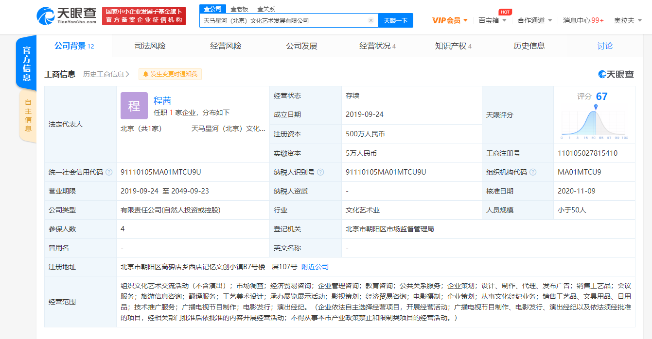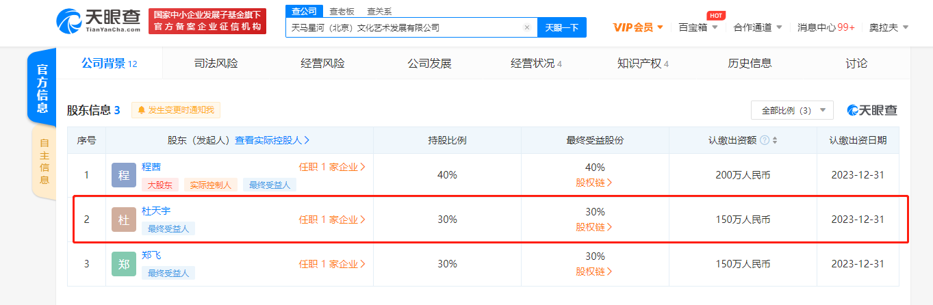 报道指出,在《青春有你》宣布的选手所属一栏可以发现杜天宇是属于“天马星河娱乐”公司的。据“天马星河娱乐”的官方微博显示,其认证为天马星河(北京)文化艺术发展有限公司。天眼查App显示,天马星河(北京)文化艺术发展有限公司成立于2019年9月,注册资本500万人民币,法定代表人为程茜。股东信息显示,杜天宇为该公司第二大股东,持股比例为30%。此外,2020年3月,该公司新增2个“杜天宇”的商标,国际分类涉及教育娱乐、广告销售。目前商标状态均显示为“商标已注册”。