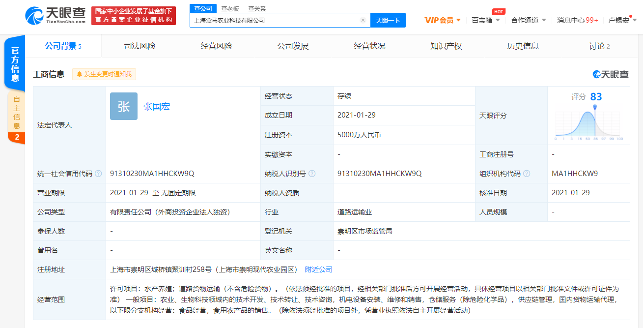 【环球网综合报道】天眼查App显示,1月29日,上海盒马农业科技有限公司成立,注册资本5000万人民币,法定代表人为张国宏,经营范围包括农业、生物科技领域内的技术开发、水产养殖等。该公司由盒马(中国)有限公司全资持股。