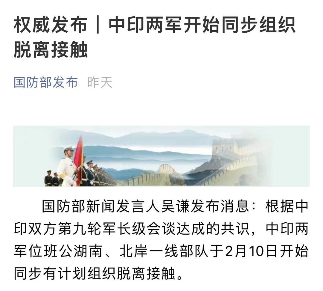 北京时间10日晚,国防部新闻发言人吴谦发布消息:根据中印双方第九轮军长级会谈达成的共识,中印两军位班公湖南、北岸一线部队于2月10日开始同步有计划组织脱离接触。中国外交部发言人汪文斌在当天记者会后回答记者提问也表示,根据中印两国外长莫斯科会晤和双方第九轮军长级会谈达成的共识,中印两军一线部队于2月10日开始在班公湖地区同步有计划组织脱离接触。希望印方与中方相向而行,严格落实双方达成的共识,确保脱离接触进程顺利实施。