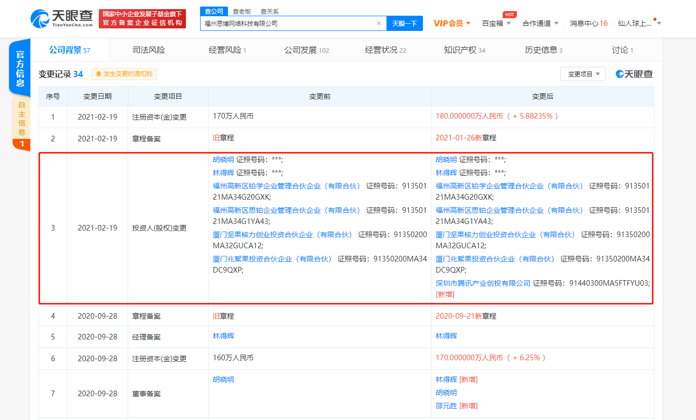【环球网教育综合报道 记者 陈全】2月19日,思博网络关联公司福州思博网络科技有限公司发生工商变更,新增股东深圳市腾讯产业创投有限公司,持股5.56%,认缴金额10万人民币,同时该公司注册资本增加至180万元,增幅约为5.88%。