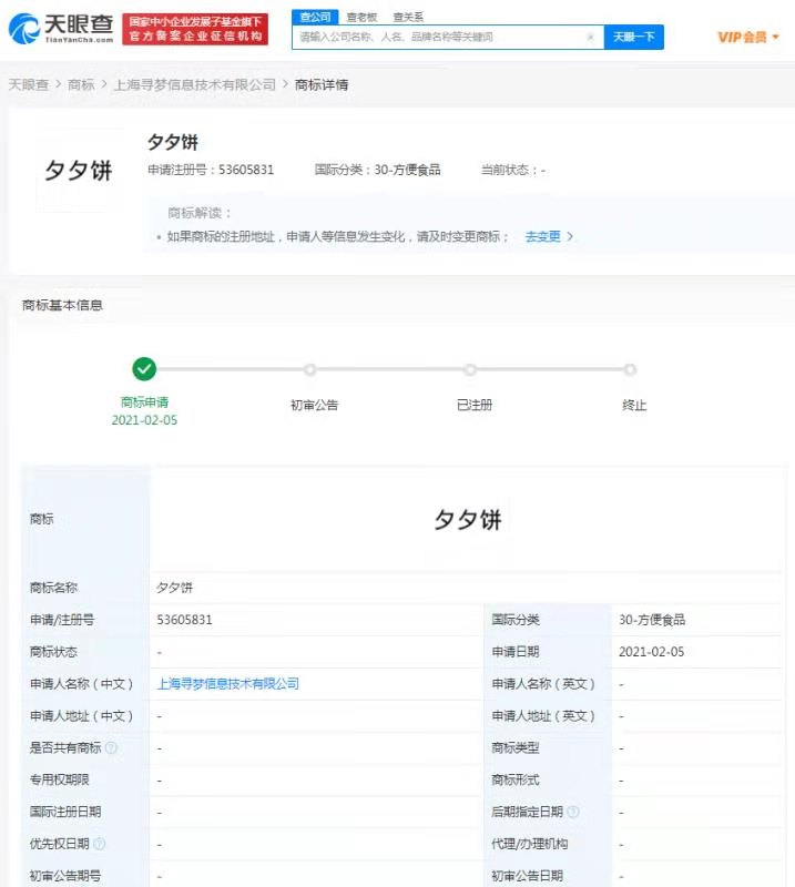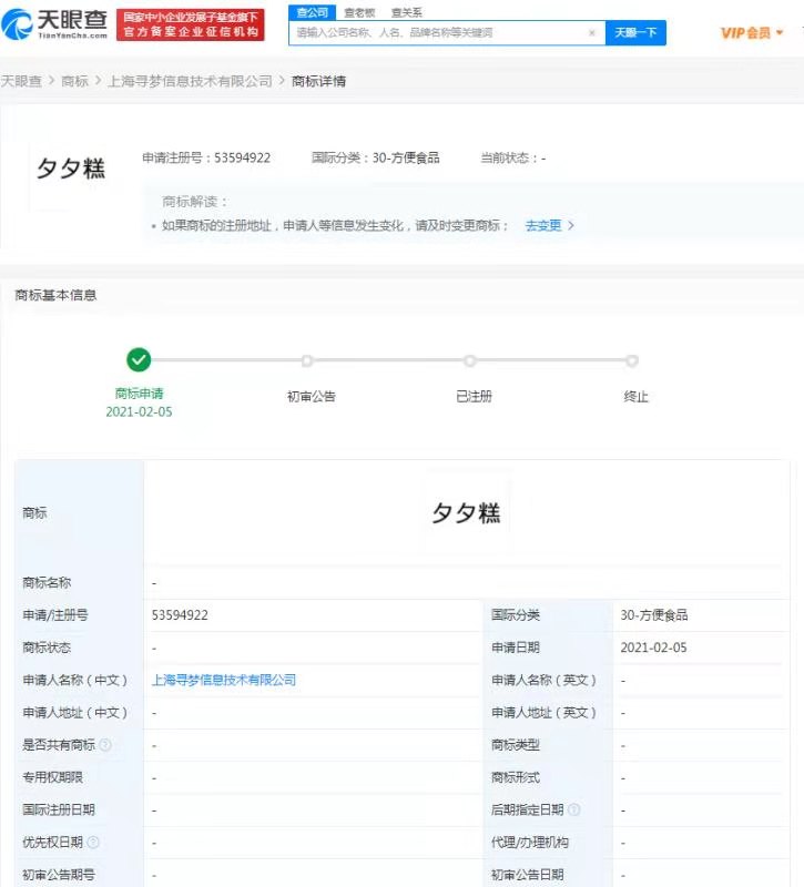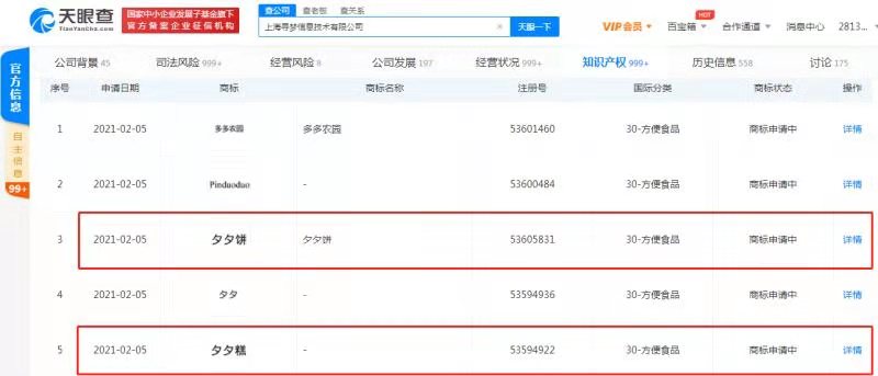 【环球网综合报道】天眼查App显示,近日,拼多多关联公司上海寻梦信息技术有限公司申请注册“夕夕饼”、“夕夕糕”商标,国际分类为方便食品,商标状态为“商标申请中”。