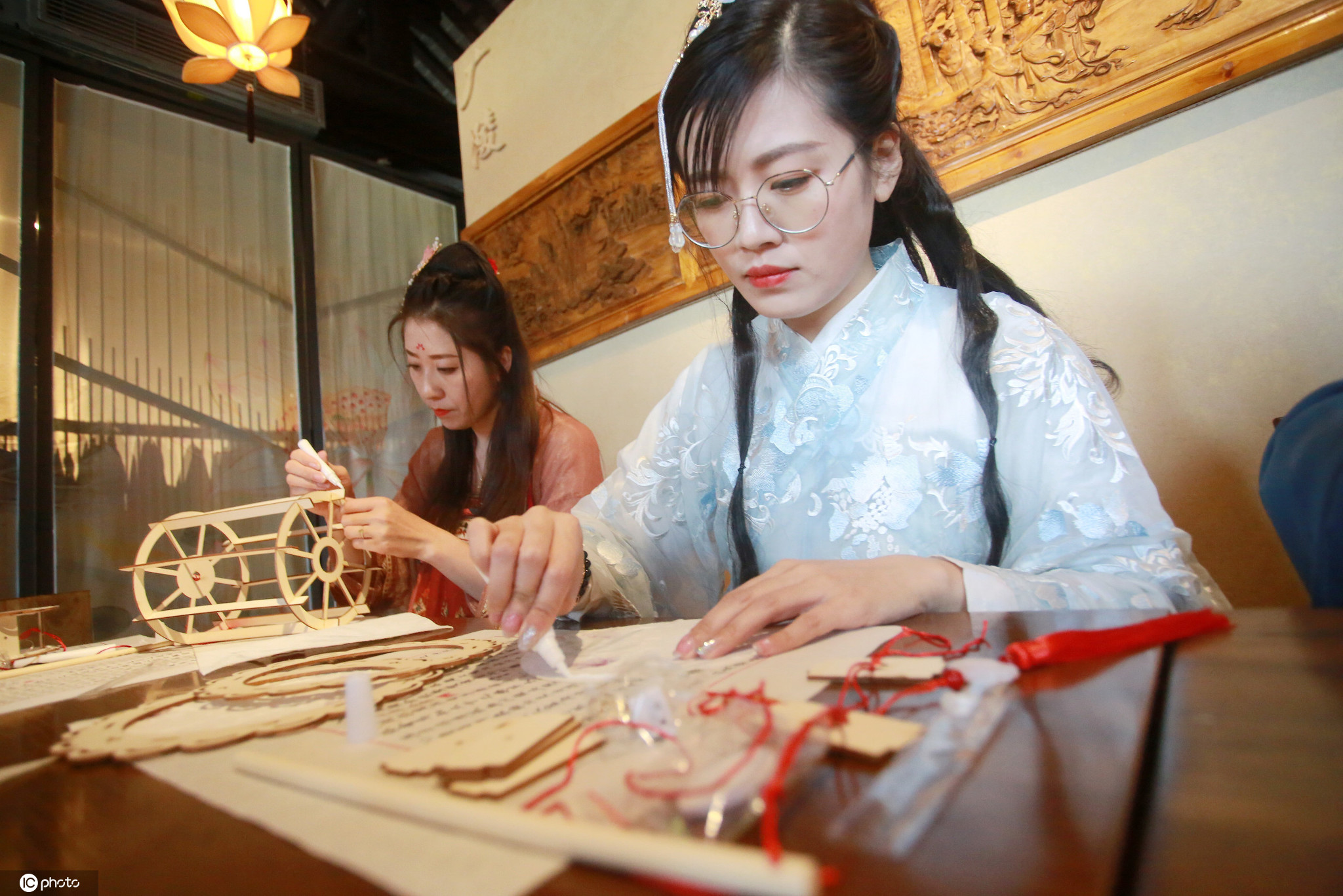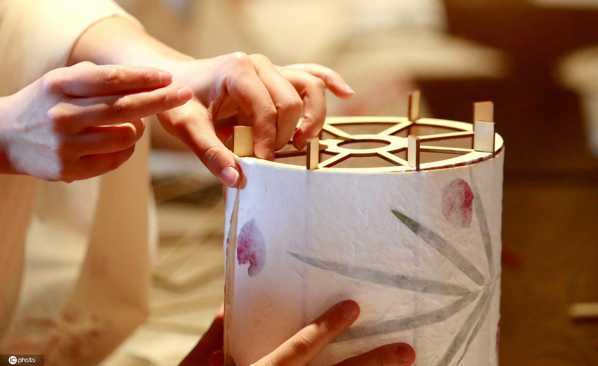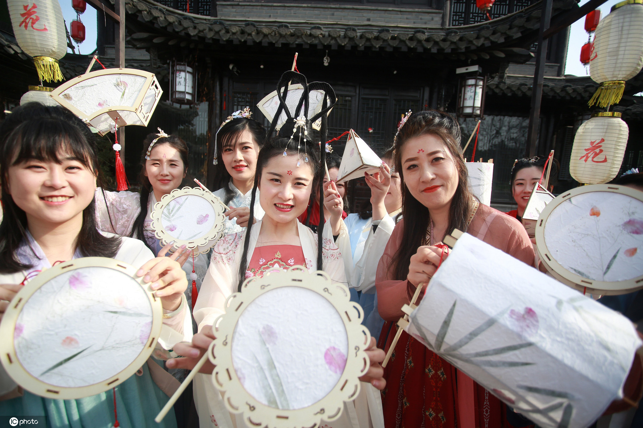 2021年2月23日,江苏扬州,元宵节临近,江苏省扬州市广陵区东关街道徐凝门街社区开展了“元宵花灯DIY”体验活动,10多汉服爱好者身穿汉服制,制作一盏盏传统手工花灯,在快乐的氛围中感受传统文化的魅力,迎接即将到来的元宵佳节。孟德龙/IC photo