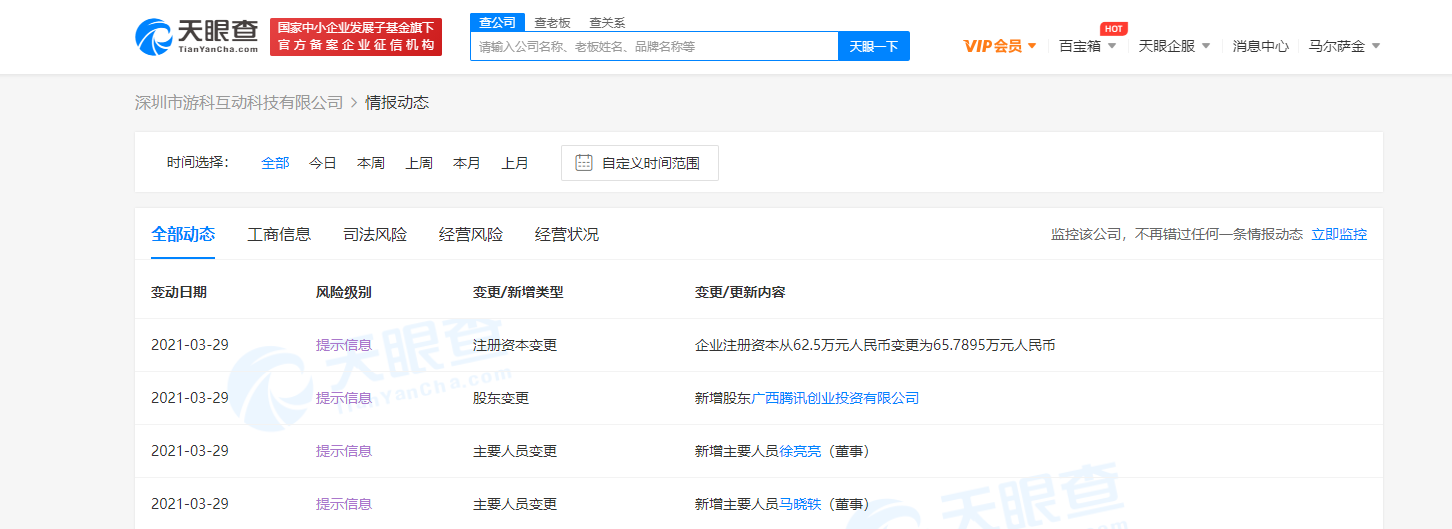 【环球网综合报道】天眼查App显示,近日,游戏科学关联公司深圳市游科互动科技有限公司发生多项工商变更,股东新增广西腾讯创业投资有限公司,持股比例约5%。同时,主要人员新增马晓轶、徐亮亮。公司注册资本由62.5万元人民币变更为约65.8万元人民币,增幅约5.28%。
