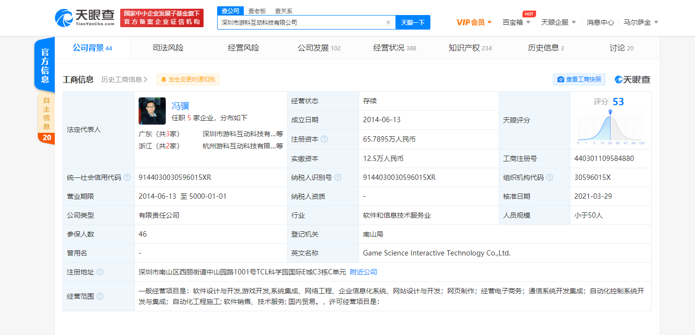 深圳市游科互动科技有限公司成立于2014年6月,法定代表人及最大股东为冯骥,持股比例约38.76%。公司经营范围含软件设计与开发;游戏开发;网页制作;经营电子商务;通信系统开发集成;国内贸易等。