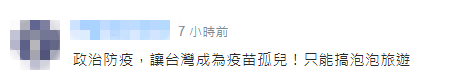 也有网友称,“政治防疫,让台湾成为疫苗孤儿!只能搞泡泡旅游。”