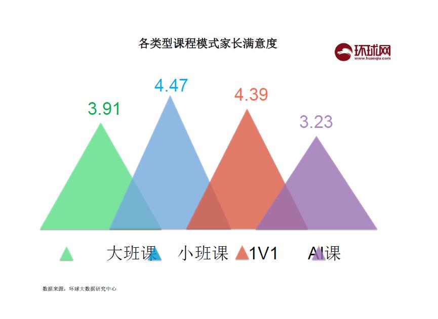 通过对不同授课模式的调研,目前在线少儿英语1V1班型仍为主流,但越来越多的家长开始尝试其他班型,其中小班课受到大家的青睐。在满分5分的情况下,小班课授课模式的满意度较高,获得了4.47分;1v1模式紧随其后,获得4.39分的满意度。
