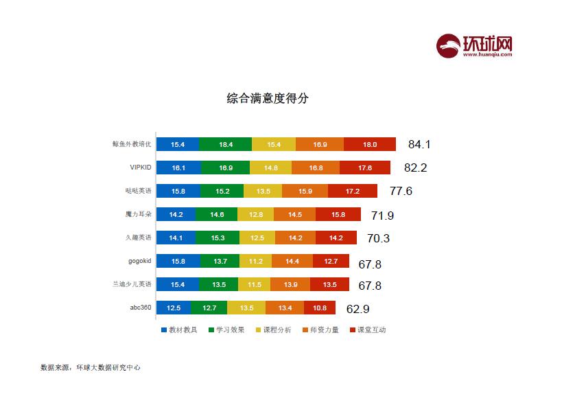 此满意度排名调研了各品牌实际用户,从教材教具、学习效果、课程分析、师资力量、课堂互动五个维度来进行打分得出。 其中,鲸鱼外教培优的学习效果一项得分较高,与其产品定位于英语素质能力培优相关。