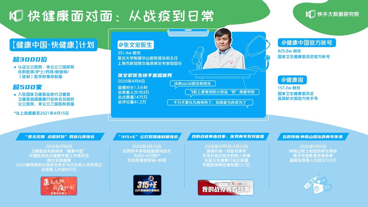 除此,众多政务机构也在快手日常发布权威资讯和一线消息。以健康卫生机构为例,在新冠疫情期间,它们在健康科普和专业辟谣等方面作出突出贡献。报告显示,截至2021年4月15日,快手"健康中国·快健康"计划共有超过500家国家卫健委及地方卫健委、卫健委直属健康行业协会及组织、公立医院和非公立三级医院入驻;认证的公立医院和非公立三级医院在职医师护士、药师、检验师、(放射)医学影像师数超3000位。