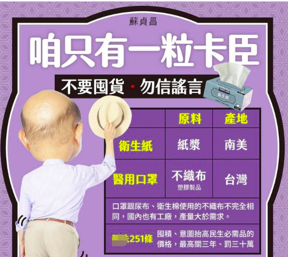 报道还称,苏贞昌也在脸书做出类似的呼吁,而在去年年初,在民众当时抢购卫生纸风潮中,苏贞昌就因呼吁人们冷静,并幽默表示“咱只有一粒卡臣(我们只有一个屁股)”而引发讨论。↓