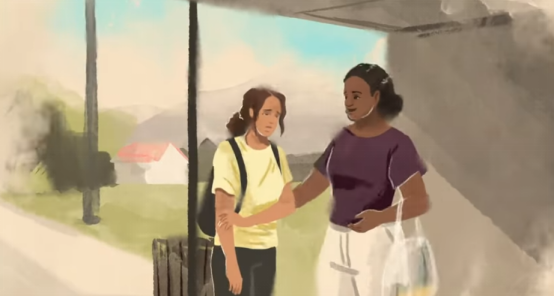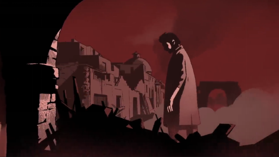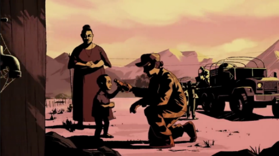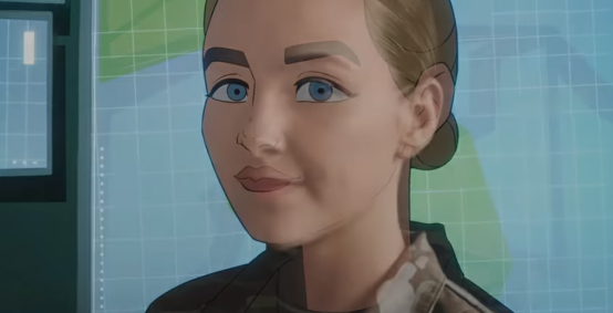 随后,画面再次变化,动画形象的艾玛与现实中的士兵艾玛重叠,暗示这个故事是根据真人真事改编。