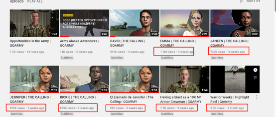 据“GoArmy”油管页面显示,这部征兵宣传片对比美军19年的宣传片,可谓播放量惨淡。除了艾玛,其他均未过百万。