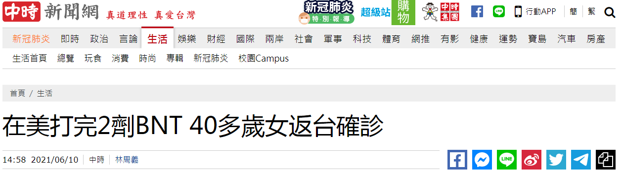 台媒:在美打完2剂BNT 疫苗,40多岁女子返台确诊