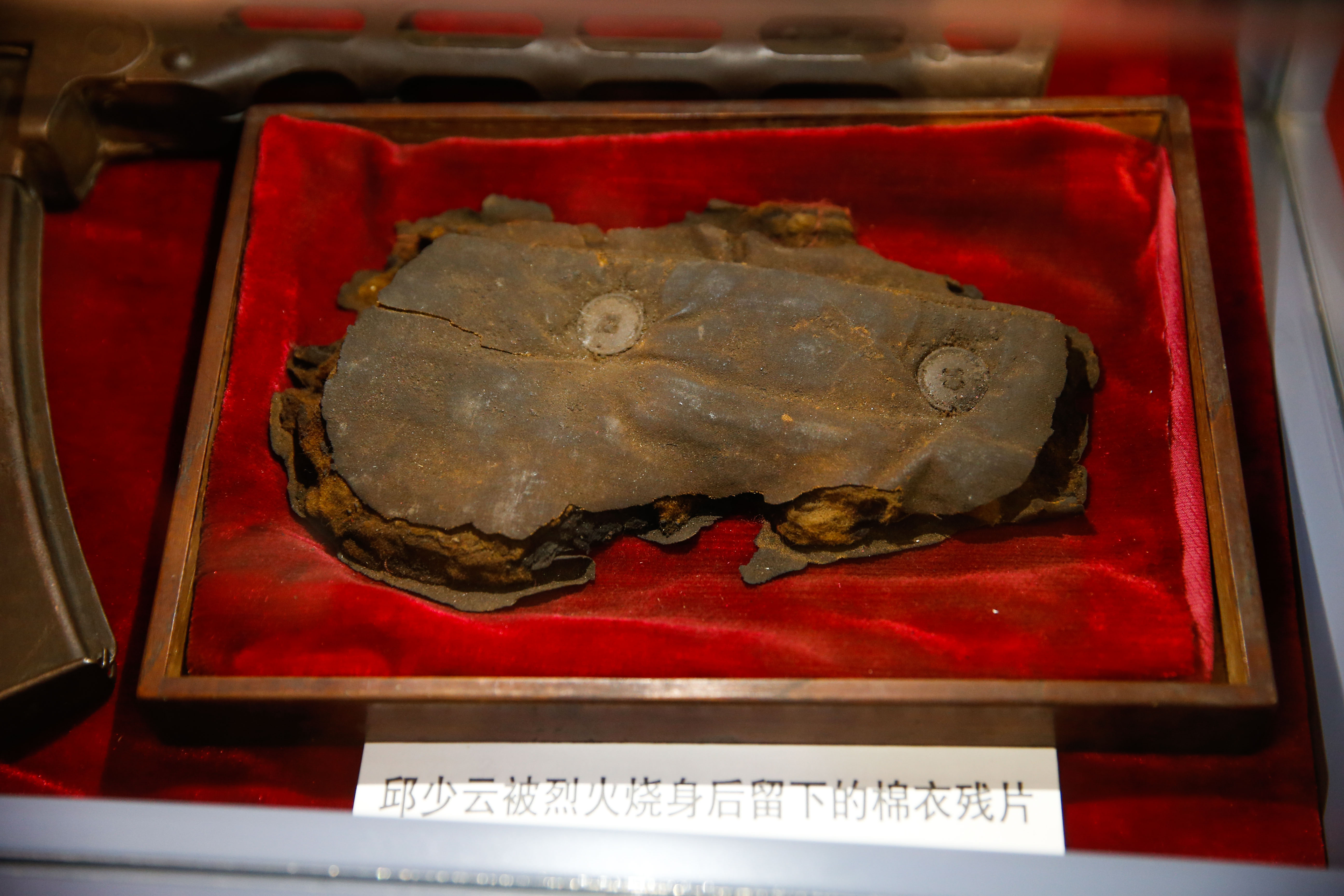 战斗结束后,战士们来到邱少云牺牲的地方,只见邱少云的遗休焦缩成一团紧贴在大地上,他的面目已无法认清,全身被烧得如同黑炭,唯一没有烧尽的,是那双深深插进泥土的双手。烈士的军衣及胶鞋几乎全都烧光,留在世上的只有烧得仅剩巴掌大的一块军衣残片,它在无声地诉说着人民军队钢铁战士在战场上是何等无比坚强。