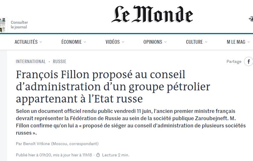 【环球网报道】据法国《世界报》12日报道,根据11日发布的一份俄罗斯官方文件,法国前总理弗朗索瓦·菲永即将加入一家活跃于石油领域的俄罗斯国有石油公司。