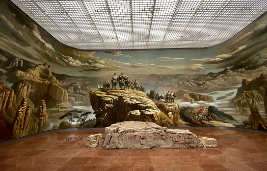 步入陈列馆,一幅巨形半景壁画映入眼帘,展现抗战时期,刘邓大军转战太行山的壮阔场景。展览主题《太行山上》,分为挺进太行、鏖战太行、情铸太行、师出太行四部分,从不同角度再现了八路军一二九师在抗日战争中的丰功伟绩,讴歌了根据地人民的无私奉献精神,展示了晋冀鲁豫抗日根据地的全面建设成就,弘扬了伟大的进组精神和抗战精神,是一部不朽的晋冀鲁豫抗战史诗。