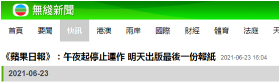 港媒:《苹果日报》今天午夜起停止运作,24日出版最后一期