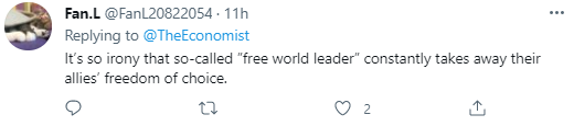 “所谓‘自由世界领导人’不断抢走他的盟友的自由选择权,多么讽刺。”