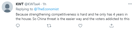 “因为增强竞争力是困难的,且他只有4年时间。所以(炒作)中国威胁是最轻松的方式,并且选民们吃这一套。”