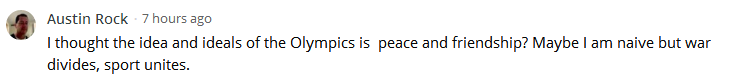 “我认为奥运会的理念和理想是和平与友谊?也许我太天真……战争分裂(世界),体育团结。”