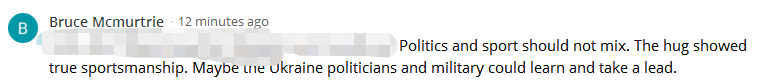 “政治和体育不应混为一谈。这个拥抱彰显了真正的体育精神。也许乌克兰政客和军方可以学习,并带个头。”