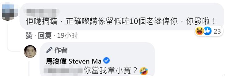 还有香港网友留言调侃马浚伟,应该是搞错了,“正确来说是留了10个老婆给你”,马浚伟连忙回应:“你当我韦小宝?”↓