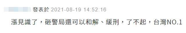 对于当事双方准备就此和解,不少岛内表示质疑,有网友就表示,“涨见识了,砸警局还可以和解、缓刑,了不起,台湾NO.1”。↓