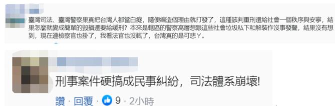 更有一些网友感叹:台湾司法、台湾警察果真把台湾人都当白痴,随便编造个理由就打发了,这种该判重刑还给社会一个秩序与安宁,结果怎么就变成简单的毁损还要给缓刑?本来是辖区的警察高层想跟这些社会垃圾私下和解装作没事发声,结果没有想到,现在连检察官也挂了,我看法官也没辄了,台湾真的是可悲呀。“刑事案件硬搞成民事纠纷,(台湾)司法体系崩坏!↓