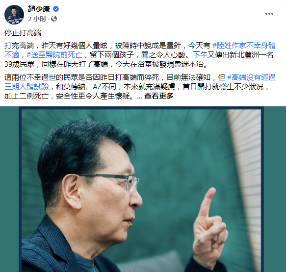 【环球网报道 记者 康博浩】据台湾“中时新闻网”和《联合报》等台媒消息,台湾自产高端疫苗昨天(23日)正式开放接种后,先是当天有多人接种后身体不适,紧接着今早就传出一作家接种后猝死,据最新消息,新北市刚刚又传出一39岁男子昨日接种“高端”疫苗,今天被发现在家中死亡。相关信息传出后,岛内网友纷纷涌入蔡英文脸书留言质疑,岛内资深媒体人赵少康今天晚些更发文呼吁停止接种“高端”疫苗。