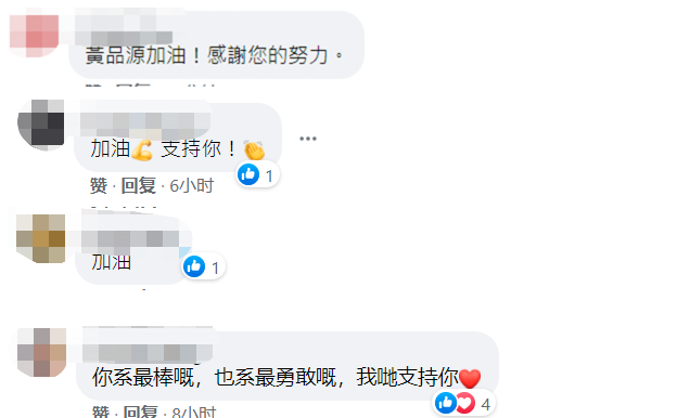 另外有不少网友为黄品源加油鼓劲,“黄品源加油!感谢您的努力”、“加油,支持你!”、“加油”、“你是最棒的,也是最勇敢的,我支持你!”。↓